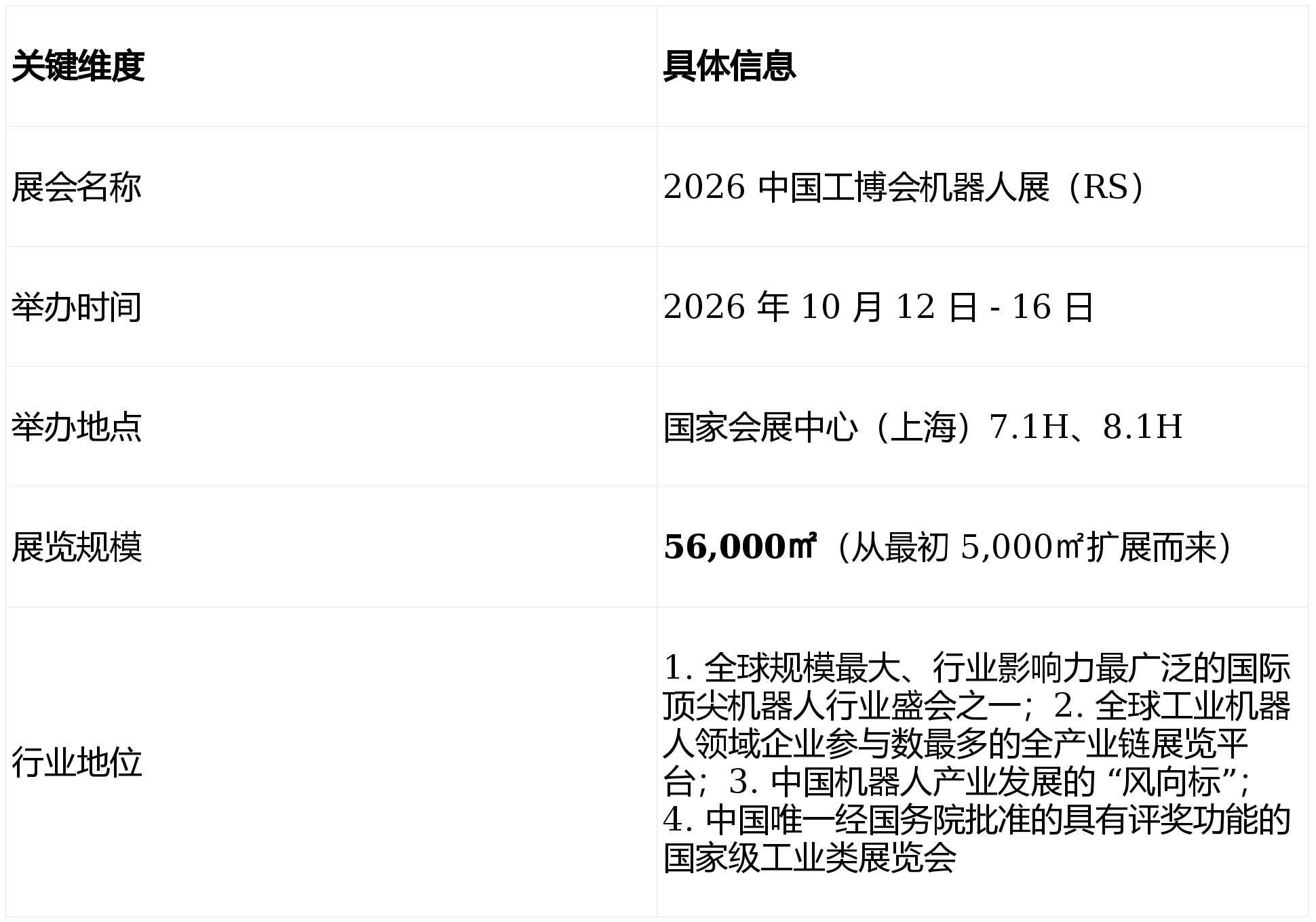 问题 2:展会笼盖的机械人及相关范畴焦点展品类别有哪些?针对哪些行业供给使用处理方案?- 深圳:2026年6月10日-12日(第七届华南国际机械人取从动化博览会),工业机械人及协做机械人:焊接机械人、码垛机械人、SCARA 机械人、协做机械人等(代表展商:FANUC、DENSO、JAKA、思灵机械人等)行业使用处理方案:3C 制制、汽车制制、食物饮料、生物医药等范畴全体方案(代表展商:哈工智能、SUPCON 等)